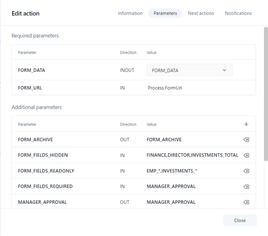 INOUT: When the action is instantiated, the value of the parameter is initialized with a text, or the value of a macro or process data, and then, when the action is being closed, the value of the parameter is stored in a process data value.