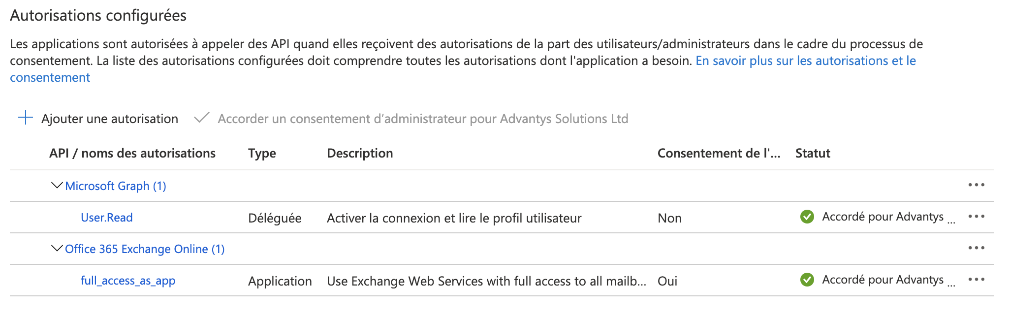 Une fois que votre application a obtenu le consentement d'administrateur, vous verrez une coche verte pour chacune des autorisations.