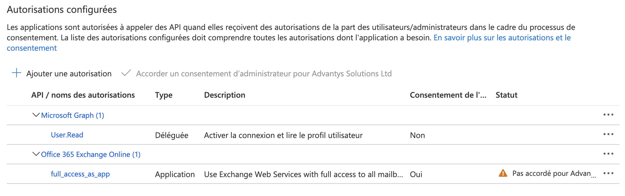 full_access_as_app.Cliquez sur Ajouter des autorisations.