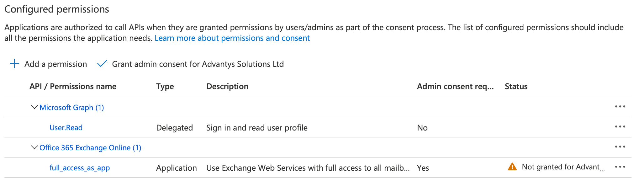 4. Once your application has admin consent granted, you'll see a green checkmark for each of the permissions.
