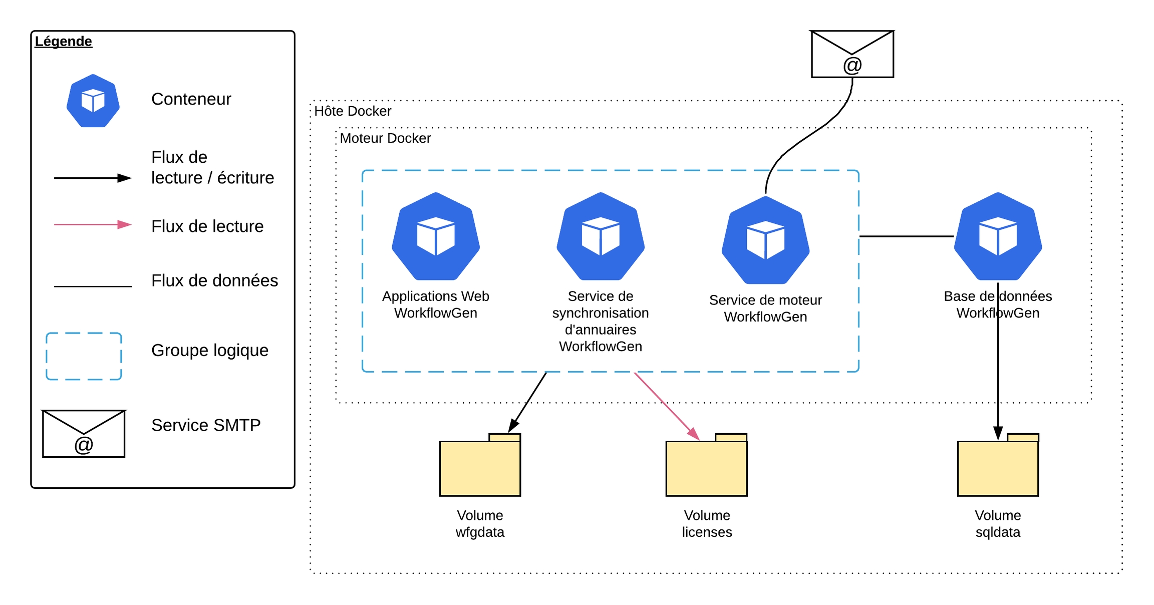 Cette section contient des détails sur l'architecture recommandée à utiliser lors du déploiement de WorkflowGen pour Docker. Le schéma suivant illustre tous les composants en action :