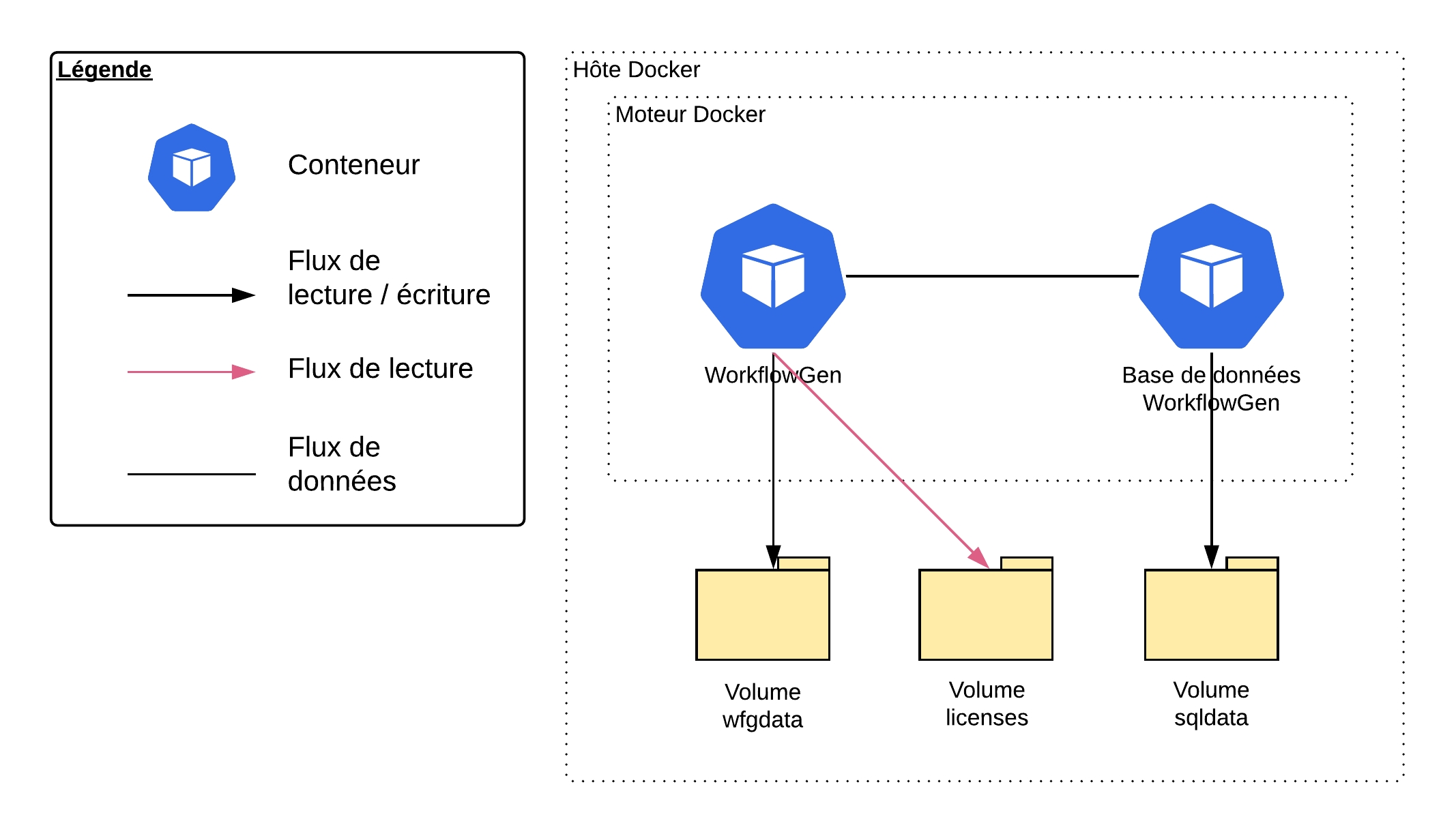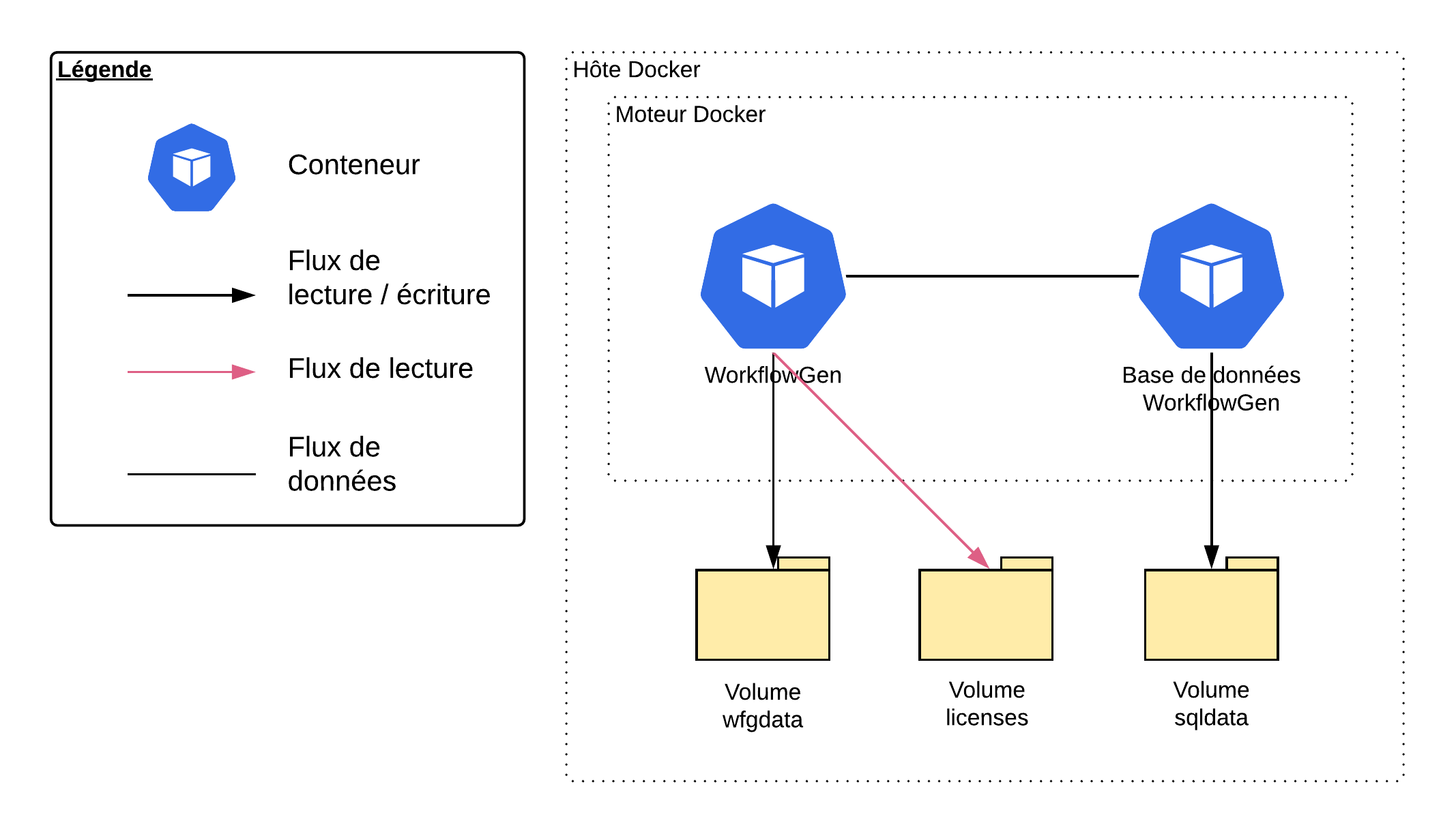 Dans le moteur Docker de votre ordinateur, vous aurez un serveur WorkflowGen en cours d'exécution et une base de données WorkflowGen qui utiliseront des volumes mappés sur votre ordinateur local pour conserver les fichiers de données.
