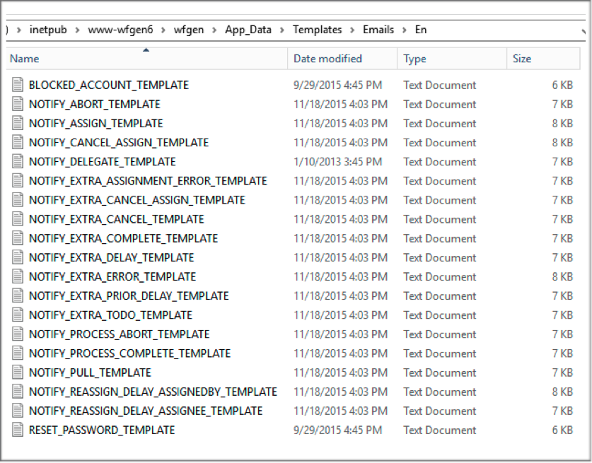 Notification templates are text files with HTML content and WorkflowGen macros. The default notification templates are located in the \wfgen\App_Data\Templates\Emails folder.