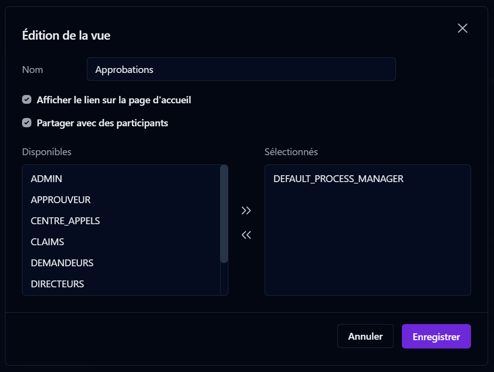 Cliquez sur Éditer pour changer la description de la vue, choisir si elle doit être incluse comme lien disponible sur le tableau de bord et la partager avec d'autres participants du processus.