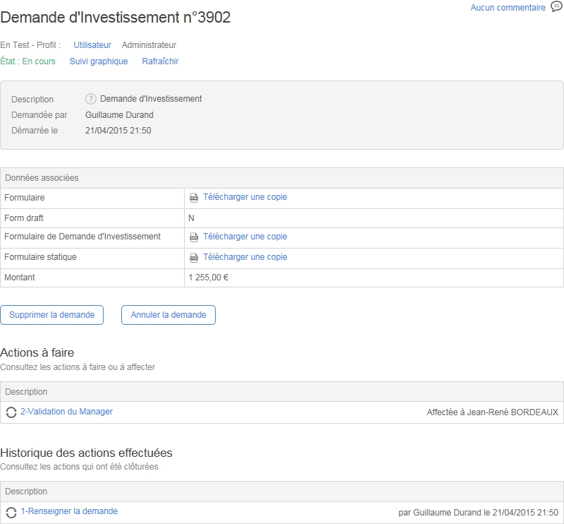 Lien affichant l’écran de suivi de l’action d’une sous-demande (uniquement visible lorsque l’action est de type sous-processus)
