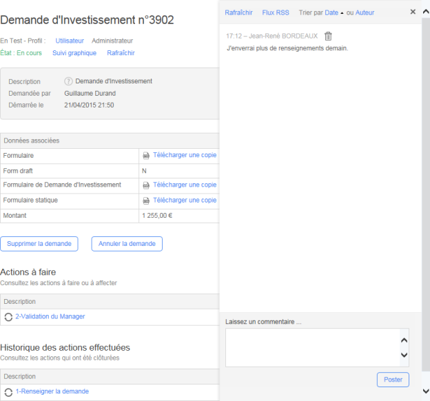 Cliquez la bulle en haut à droite pour ouvrir un panneau coulissant qui affiche la liste des commentaires de la demande et où vous pouvez écrire des commentaires