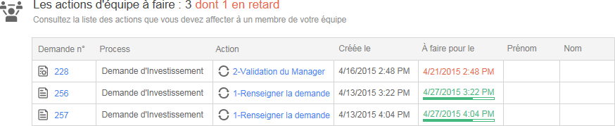 Si l’utilisateur est un administrateur, il a accès à la liste de toutes les actions en cours et en retard de tous les processus. Les utilisateurs peuvent enregistrer une vue de la liste des demandes actuelles.