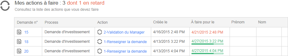 L’accès à la liste des actions en cours et en retard est donné à l’utilisateur s’il est gestionnaire ou superviseur de processus (en fonction des processus qu’il gère).