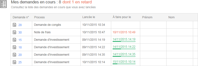 L’accès à la liste des demandes en cours et en retard est donné à l’utilisateur s’il est gestionnaire ou superviseur de processus (en fonction des processus qu’il gère).
