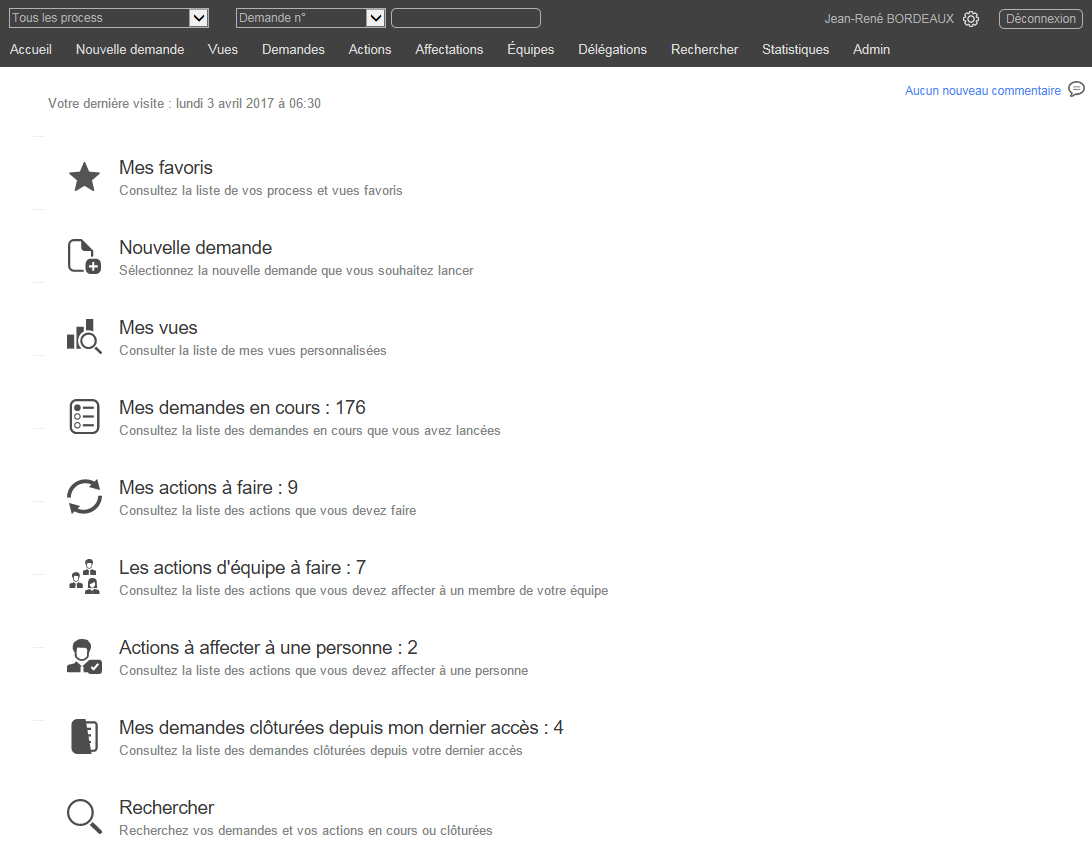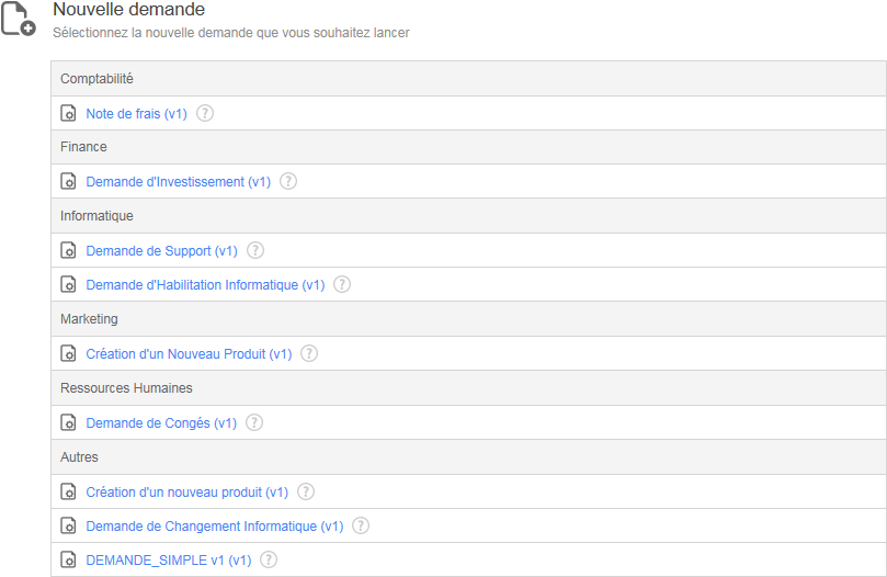 Ceci est la liste de demandes pouvant être lancées par l’utilisateur. Les nouvelles demandes peuvent être regroupées par catégories.