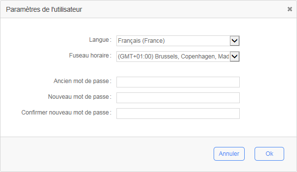 Le panneau Paramètres de l’utilisateur est accédé en cliquant l’icône d’engrenage en haut à droite de l’écran du portail utilisateur. Vous pouvez sélectionner votre langue et fuseau horaire et changer votre mot de passe depuis ce panneau.