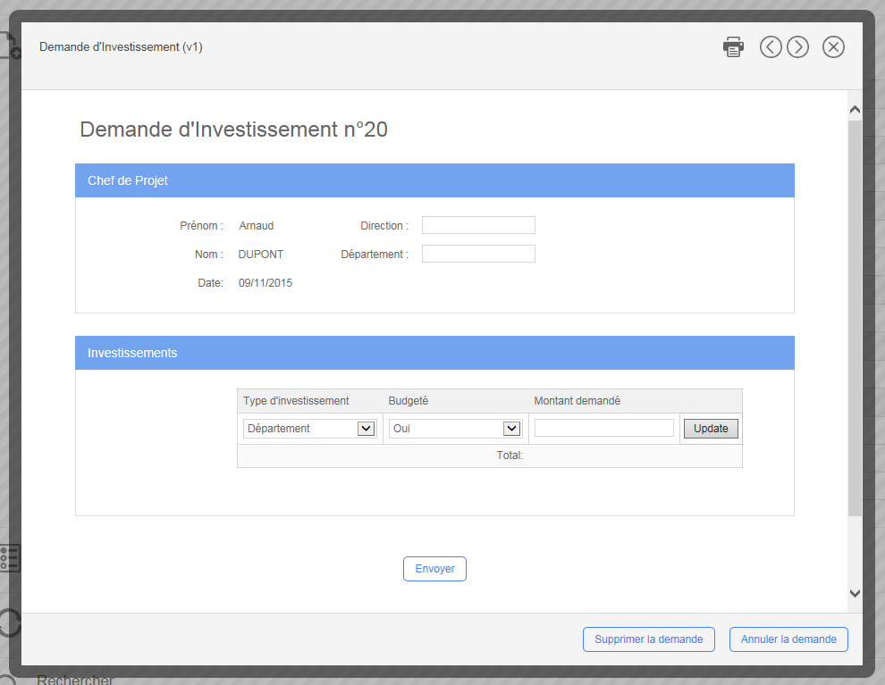 Si la fonctionnalité Quick View est activée dans le Module d’administration et que l'icône correspondante a été cliquée, le formulaire de demande du process s’affichera avec une boîte de dialogue (pop-up).
