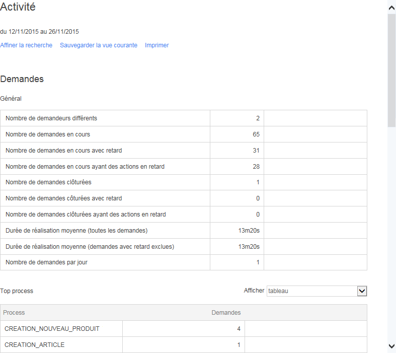 Le formulaire de statistiques d'activité permet la création de vues et de rapports sur les demandes en cours (en temps réel) mais également sur les demandes dans n’importe quelle période de temps.