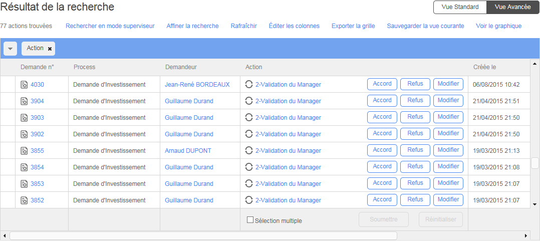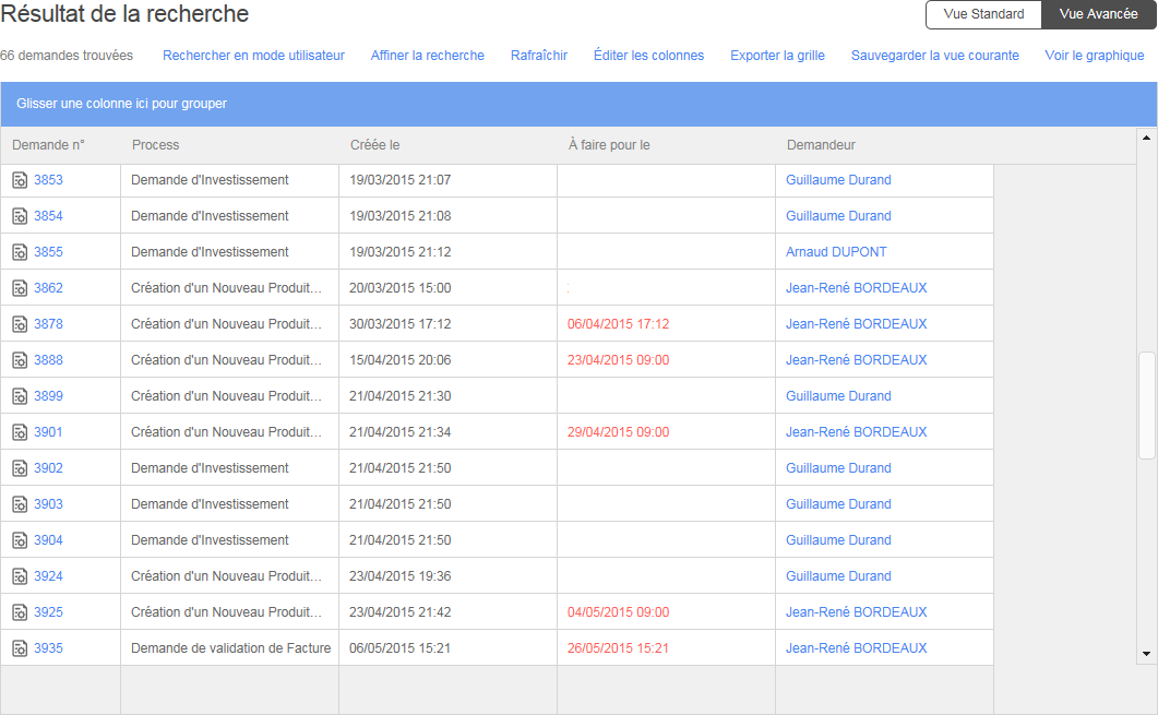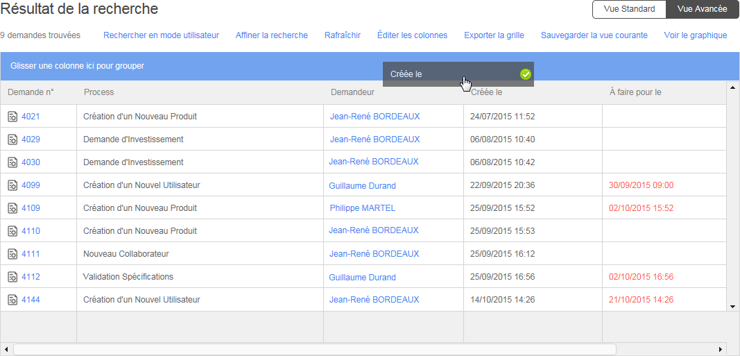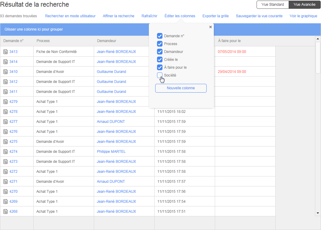La Vue avancée vous permet de personnaliser le format des résultats de vos recherches. Cette fonctionnalité vous permet de visualiser les informations ciblées en filtrant et en organisant l’information en fonction de vos besoins. Vous pouvez aussi sauvegarder les vues, utiliser la fonctionnalité d’Approbation rapide pour valider les demandes et créer et personnaliser des graphiques.