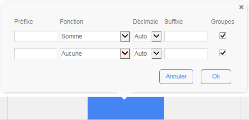 Le pied de page de la colonne deviendra bleu lorsque vous le survolez avec la souris; cliquez-le pour ouvrir la fenêtre d’édition du pied de page. Depuis cette fenêtre, vous pouvez ajouter différents types d’informations, telles que les valeurs moyennes, minimales et maximales, etc...