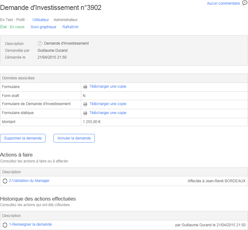 Lien affichant l’écran de suivi de l’action d’une sous-demande (uniquement visible lorsque l’action est de type sous-processus)