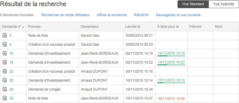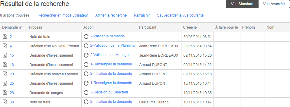 Si l’utilisateur est un administrateur, il a accès à la liste de toutes les actions en cours et en retard de tous les processus. Les utilisateurs peuvent enregistrer une vue de la liste des demandes actuelles.