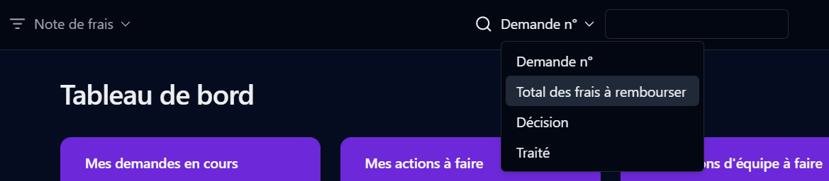 Ouvre l'écran Recherche, qui contient un formulaire permettant de rechercher des demandes et des actions