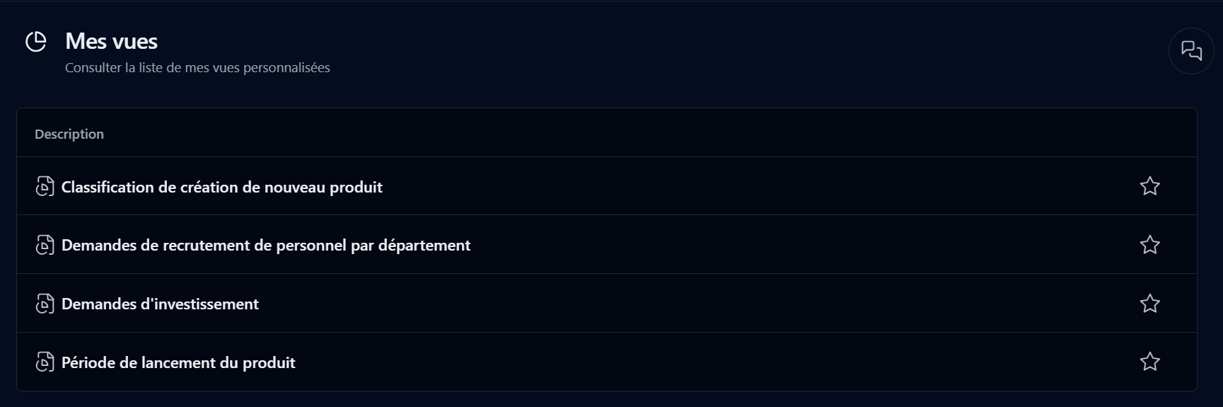 Pour ajouter ou retirer un processus ou une vue de votre liste de favoris, survolez son nom dans la liste Nouvelle demande ou Mes vues et cliquez sur l'étoile contourée à droite. (Vous pouvez également retirer des favoris directement dans la liste Mes favoris).