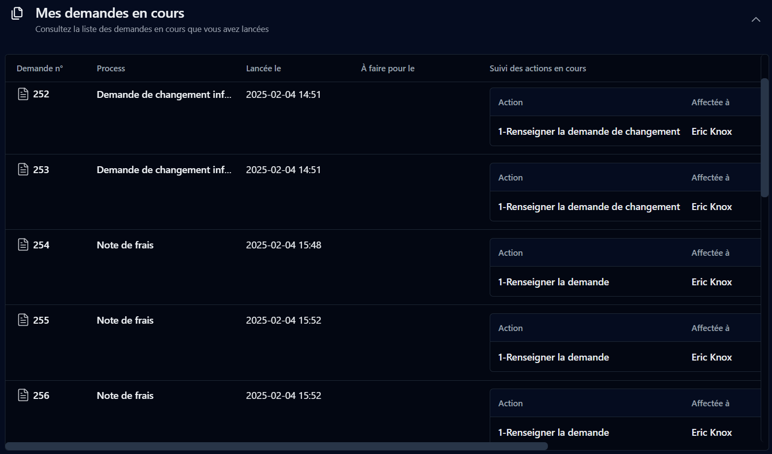 Si vous êtes administrateur, vous pouvez accéder à la liste des demandes en cours ou en retard pour tous les processus. Vous pouvez enregistrer la vue actuelle de la liste des demandes.