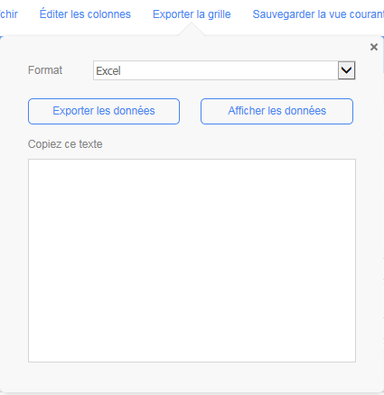 Vous pouvez exporter vos résultats en cliquant sur le lien Exporter la grille situé juste au-dessus de la grille. Cette option vous permet d’exporter les résultats sous forme de fichier téléchargeable dans différents formats (Excel 2007 (XLSX), Excel (XLS), XML, CVS, HTML, JSON, TSV), ou dans la zone de texte Copier le texte suivant, où vous pouvez copier le contenu vers un autre emplacement en cliquant sur le bouton Afficher les données (non supporté par le format XLSX).