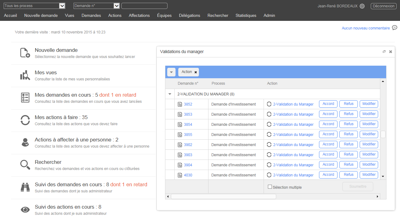 Dans la liste des résultats de la recherche, des boutons (par exemple Accord, Refus ou Modifier, tels que définis dans le formulaire du processus) seront affichés à côté des actions de validation pour lesquelles l’Approbation rapide à été activée. Cette fonctionnalité vous permet de traiter des multiples demandes de validation aisément et rapidement. (Si vous avez des actions autres que des validations, vous pouvez trier la liste par type d’action en glissant l’entête de la colonne Action dans la bandeau bleu afin de regrouper toutes vos actions de validation.)