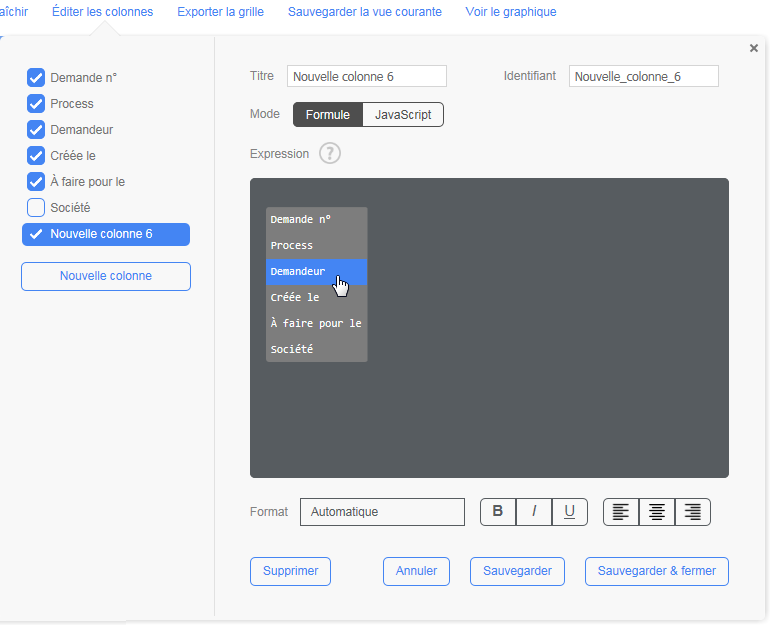 Vous pouvez saisir ou modifier le contenu d’une colonne soit via l’onglet Formule soit via l’onglet JavaScript.