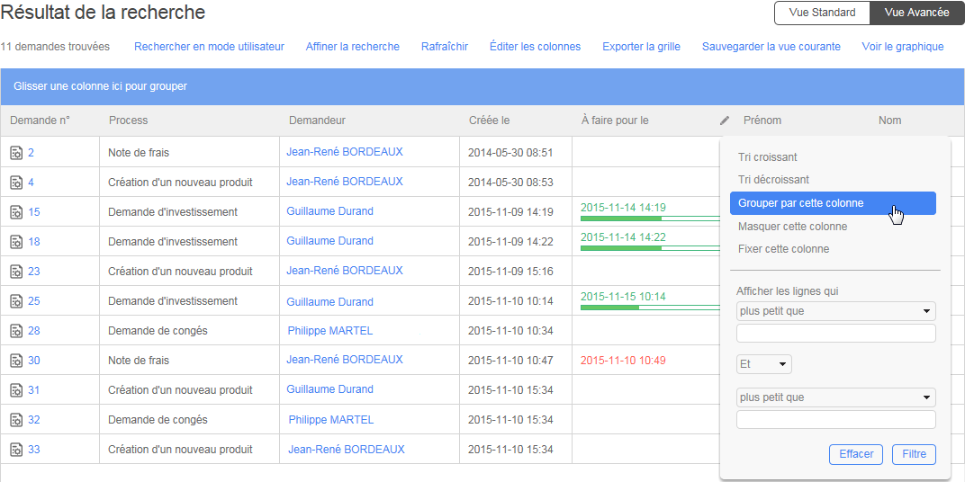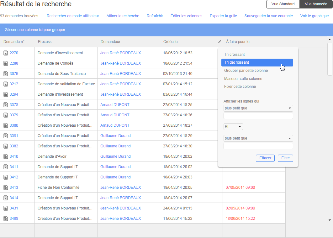 La Vue avancée vous permet de personnaliser le format des résultats de vos recherches. Cette fonctionnalité vous permet de visualiser les informations ciblées en filtrant et en organisant l’information en fonction de vos besoins. Vous pouvez aussi sauvegarder les vues, utiliser la fonctionnalité d’Approbation rapide pour valider les demandes, et créer et personnaliser des chartes.