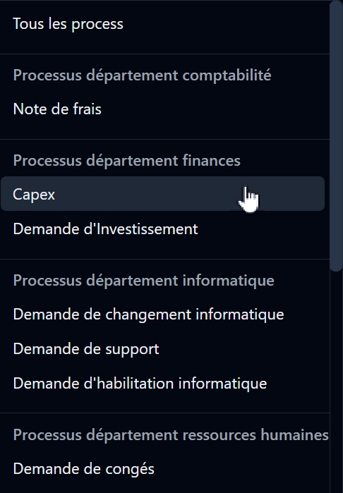 Cette liste est filtrée en fonction du profil de l’utilisateur et de son rôle dans les processus.
