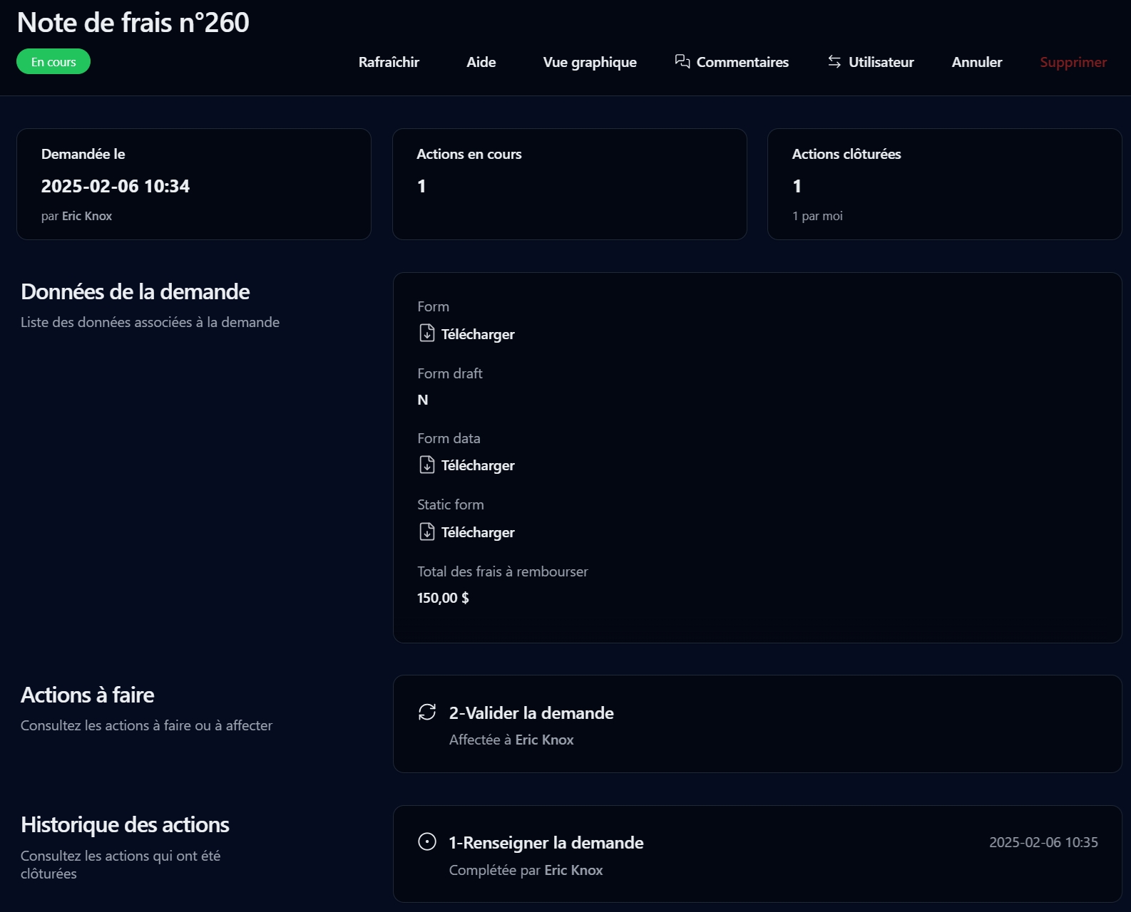 Cliquez la bulle en haut à droite pour ouvrir un panneau coulissant qui affiche la liste des commentaires de la demande et où vous pouvez écrire des commentaires