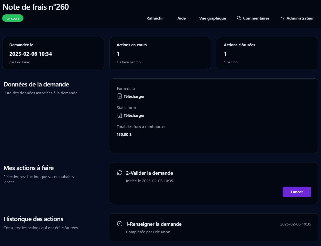 Cliquez pour basculer entre la vue Utilisateur et la vue Administrateur (si l'utilisateur possède des droits de superviseur sur la demande)