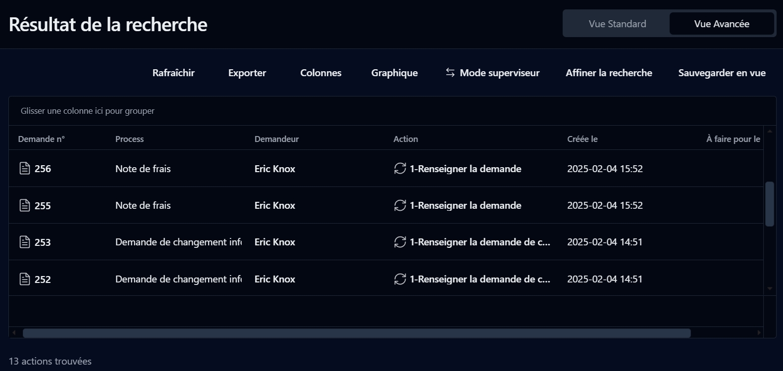 Si vous êtes administrateur, vous pouvez accéder à la liste des demandes en cours ou en retard pour tous les processus. Vous pouvez enregistrer la vue actuelle de la liste des demandes.