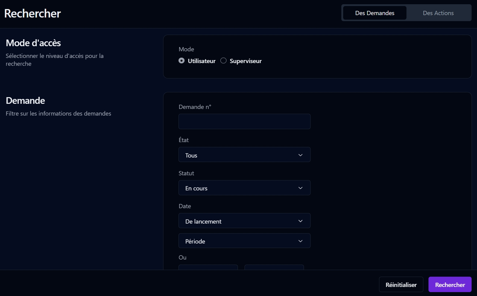 Cliquez sur Des Demandes pour la recherche des demandes ou sur Des Actions pour la recherche des actions. Le formulaire de recherche est en mode Utilisateur par défaut.