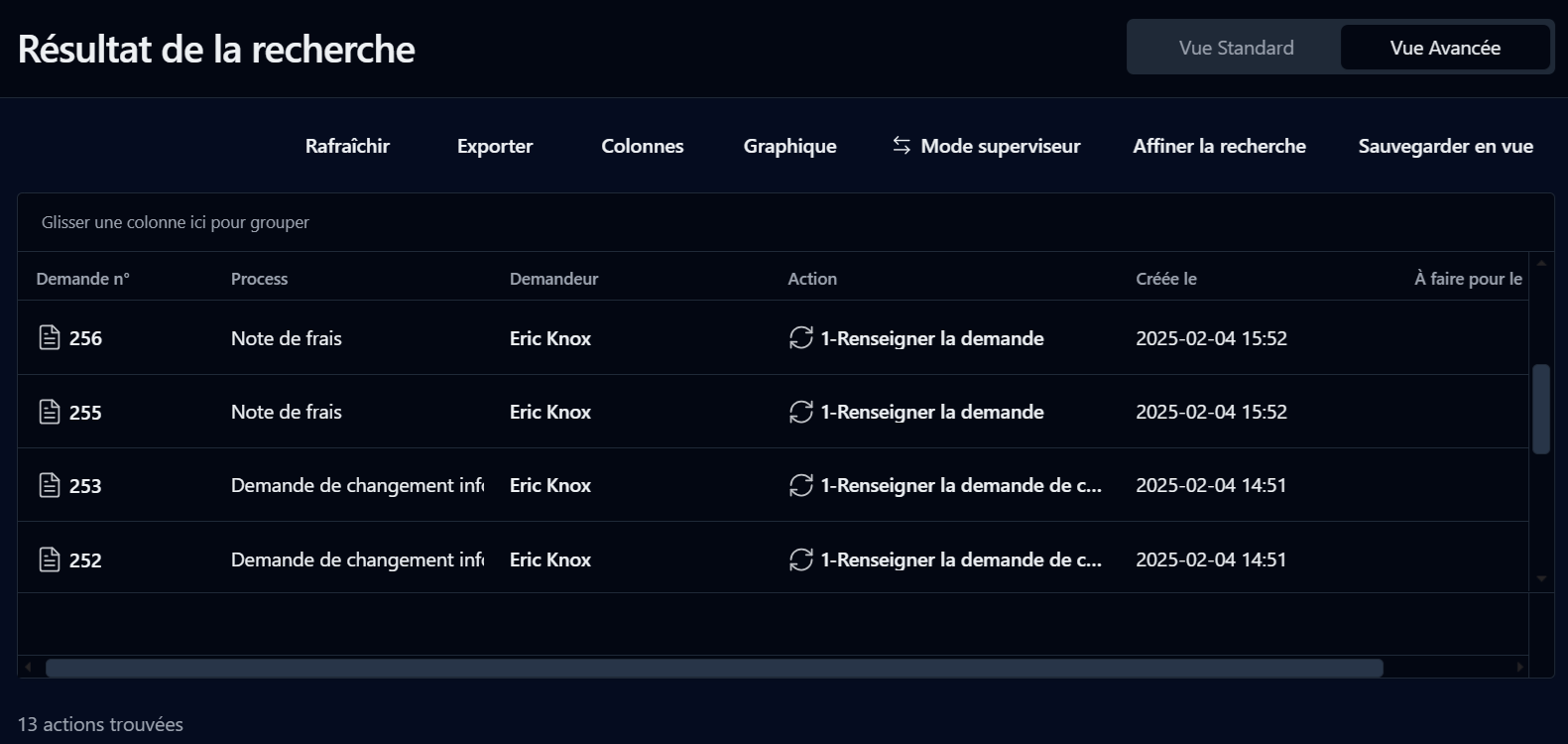 Si vous êtes administrateur, vous pouvez accéder à la liste des demandes en cours ou en retard pour tous les processus. Vous pouvez enregistrer la vue actuelle de la liste des demandes.