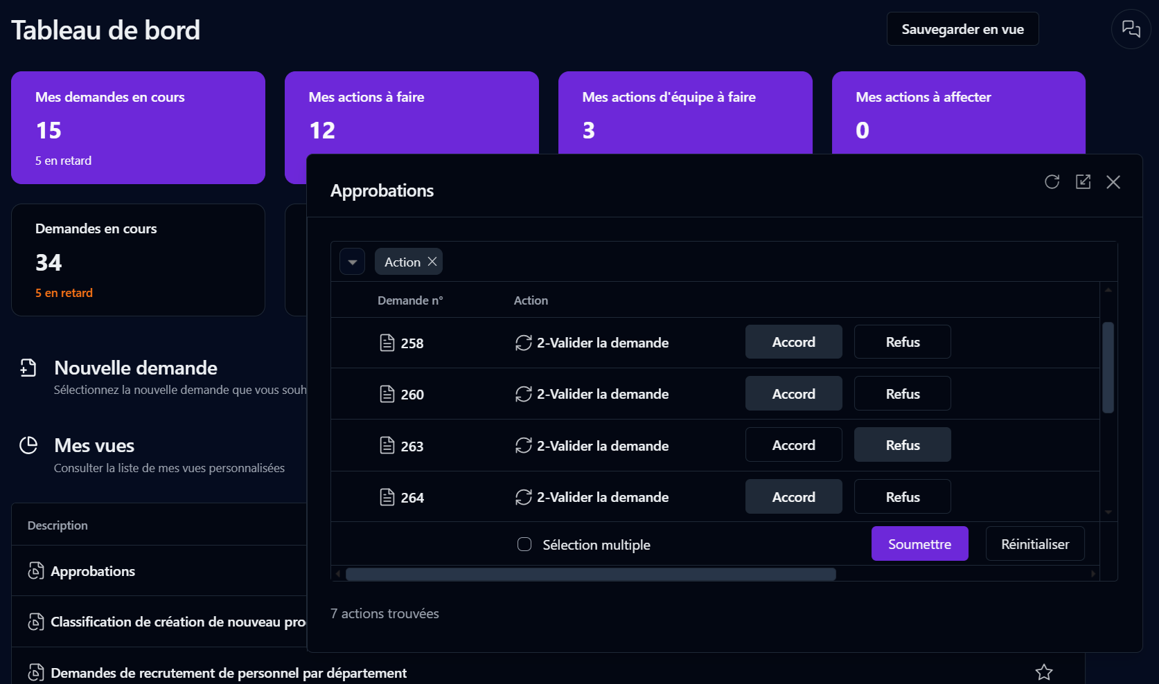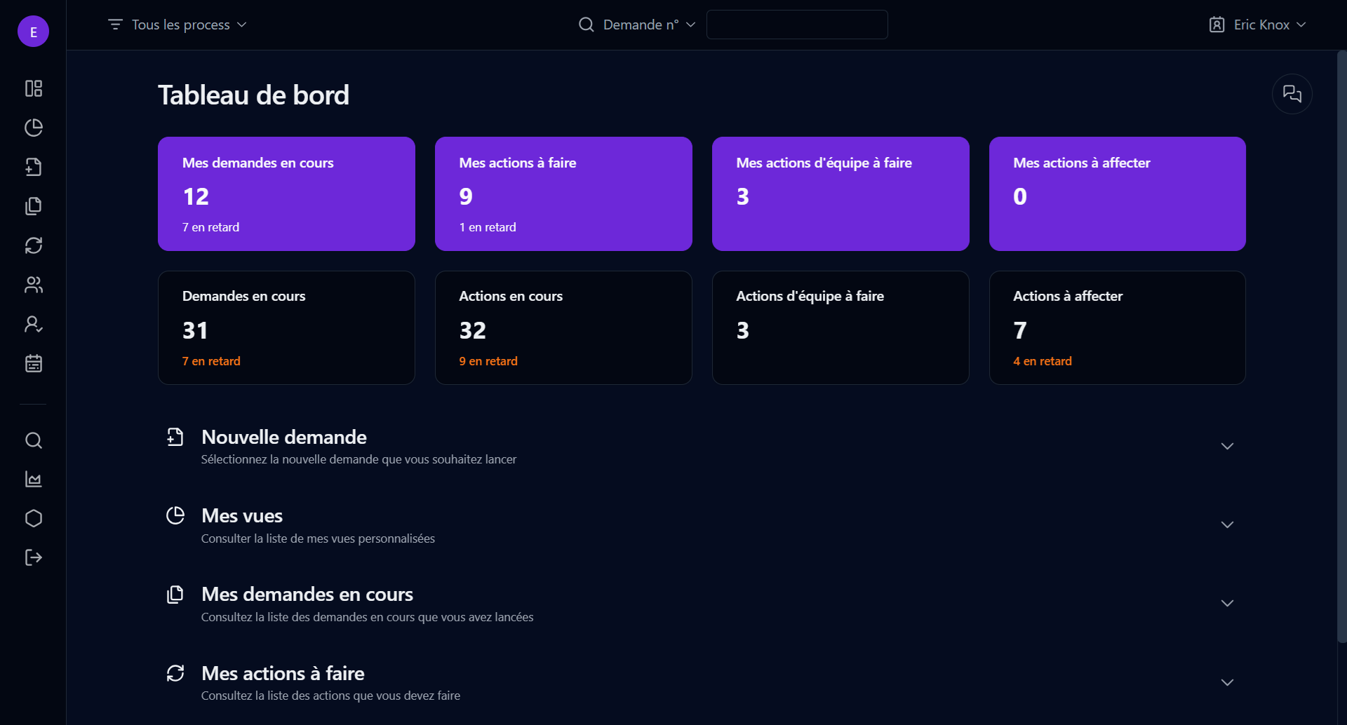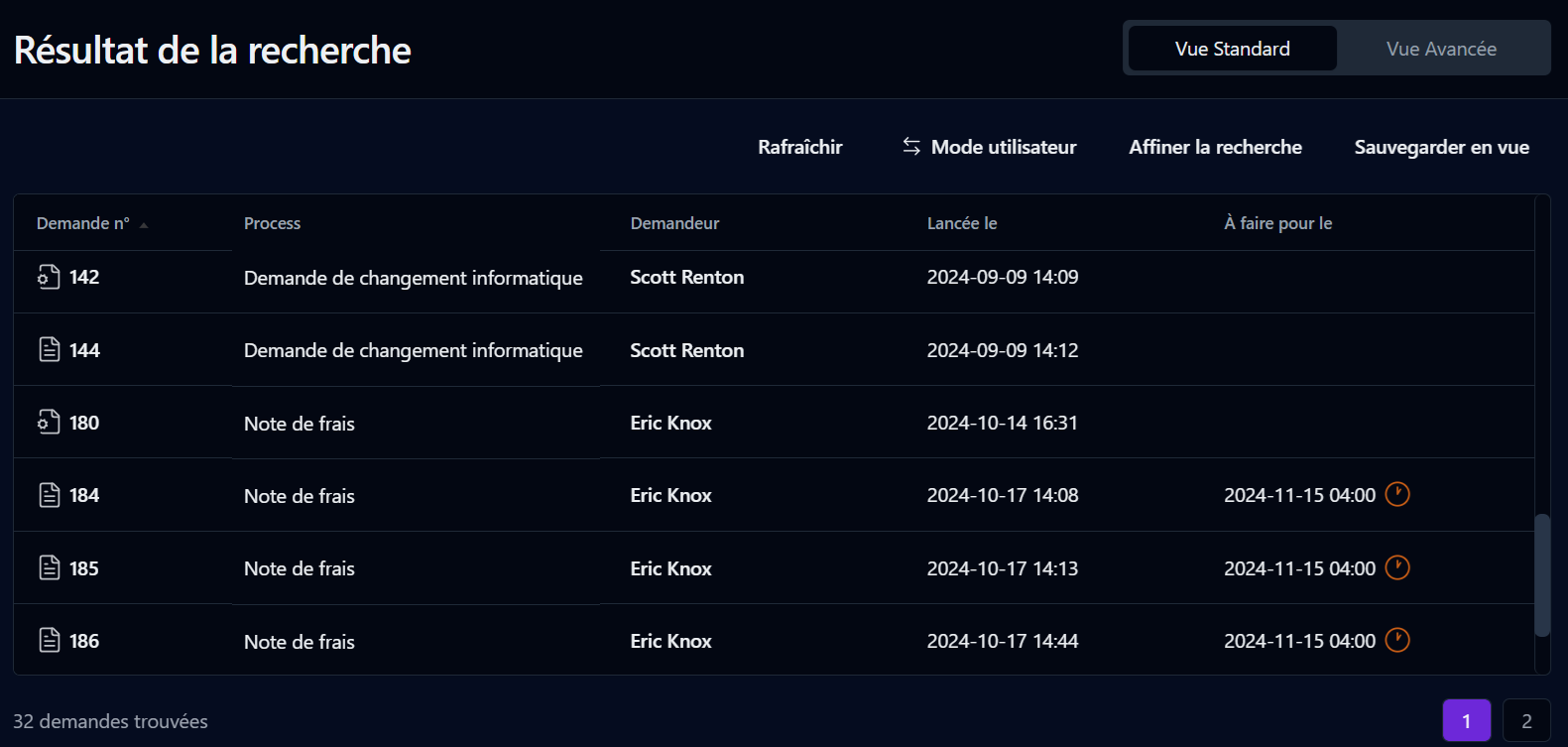 Si vous êtes administrateur, vous pouvez accéder à la liste des demandes en cours ou en retard pour tous les processus. Vous pouvez enregistrer la vue actuelle de la liste des demandes.