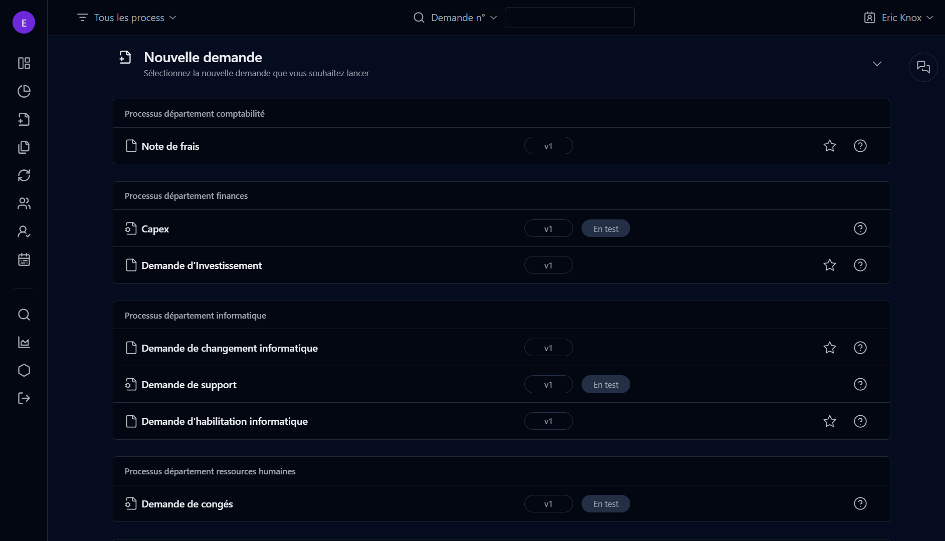 Pour ajouter ou retirer un processus de votre liste de favoris, cliquez sur l'étoile contourée. Seuls les processus ayant le statut Actif peuvent être ajoutés aux favoris.