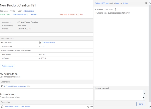 A slide-out panel on the right allows the participants of the request to post free-form comments.