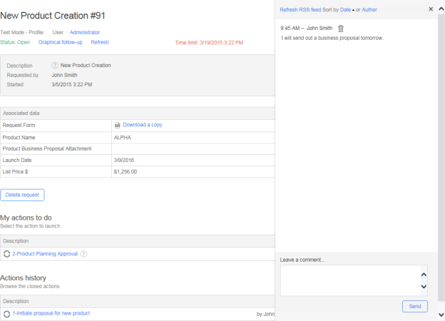 A slide-out panel on the right allows the participants of the request to post free-form comments. Users can: