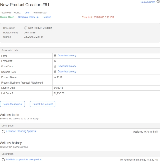 By default, clicking the action name launches the action, but you can configure WorkflowGen in order to change this behavior and display the action follow-up form instead of launching the action.