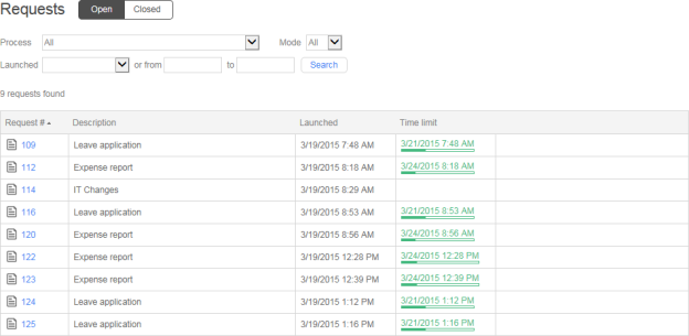 This page displays ongoing and closed requests launched by the user.