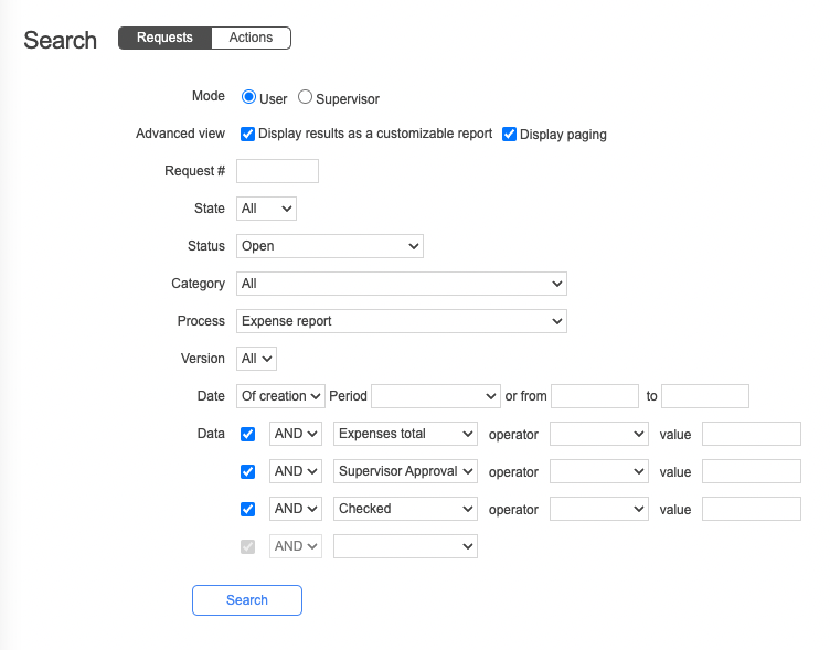 Click Requests to search requests or Actions to search actions. The search form is in User mode by default and includes the following search filters: