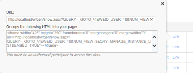 Selecting Link displays the URL and the HTML of the view, which you can use to embed the view in an external page.