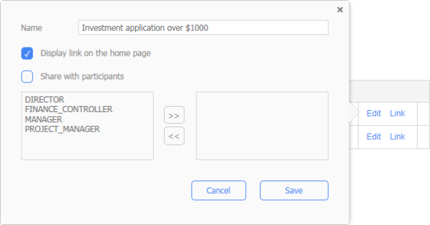 Selecting Edit allows you to change the description of the view, choose whether to include the view as an available link on the home page, and share the view with other process participants.