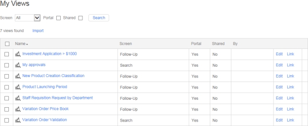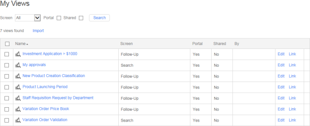 To import a view, click the Import link above the list, select the view's .xml definition file that was previously exported, then click Import.