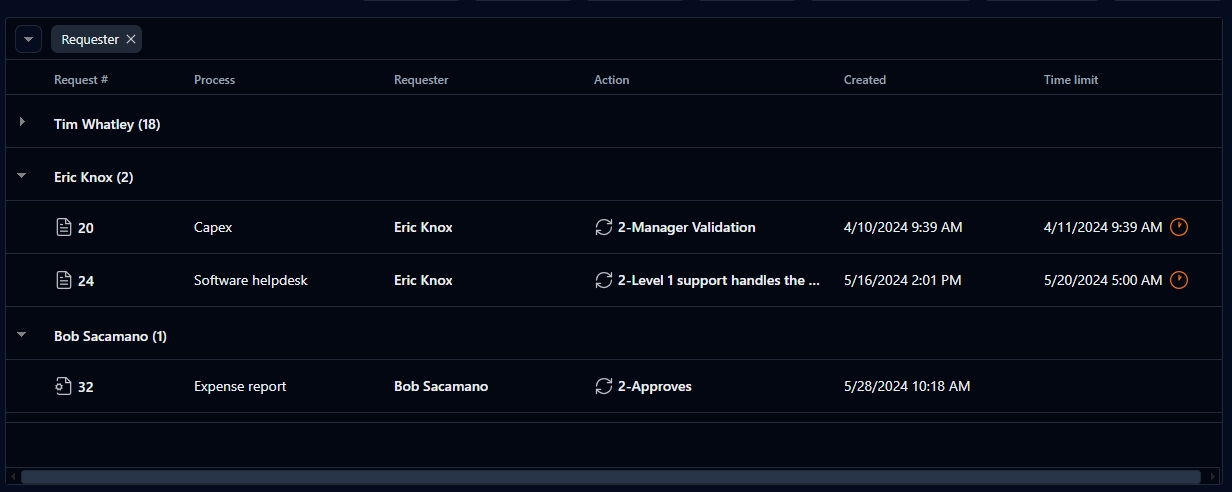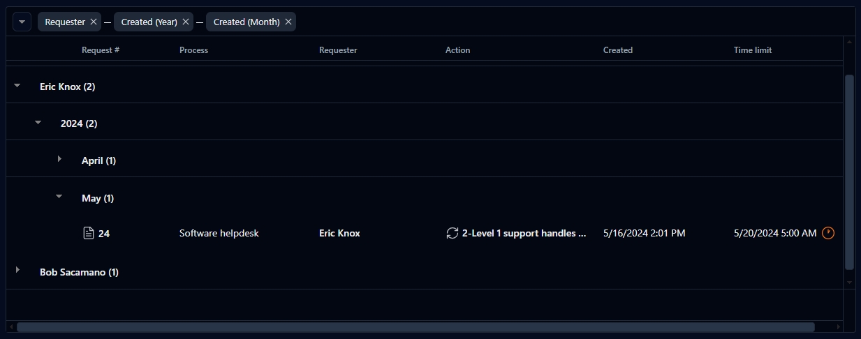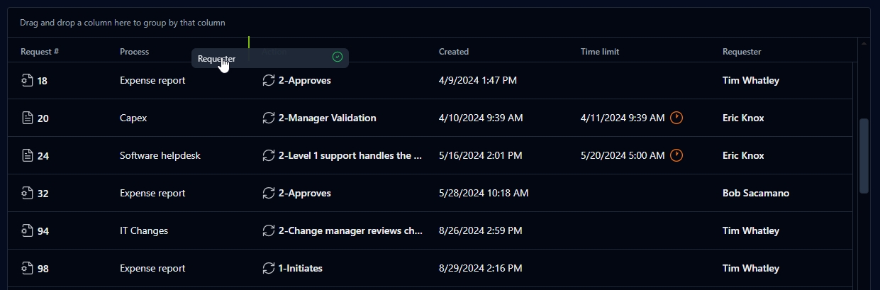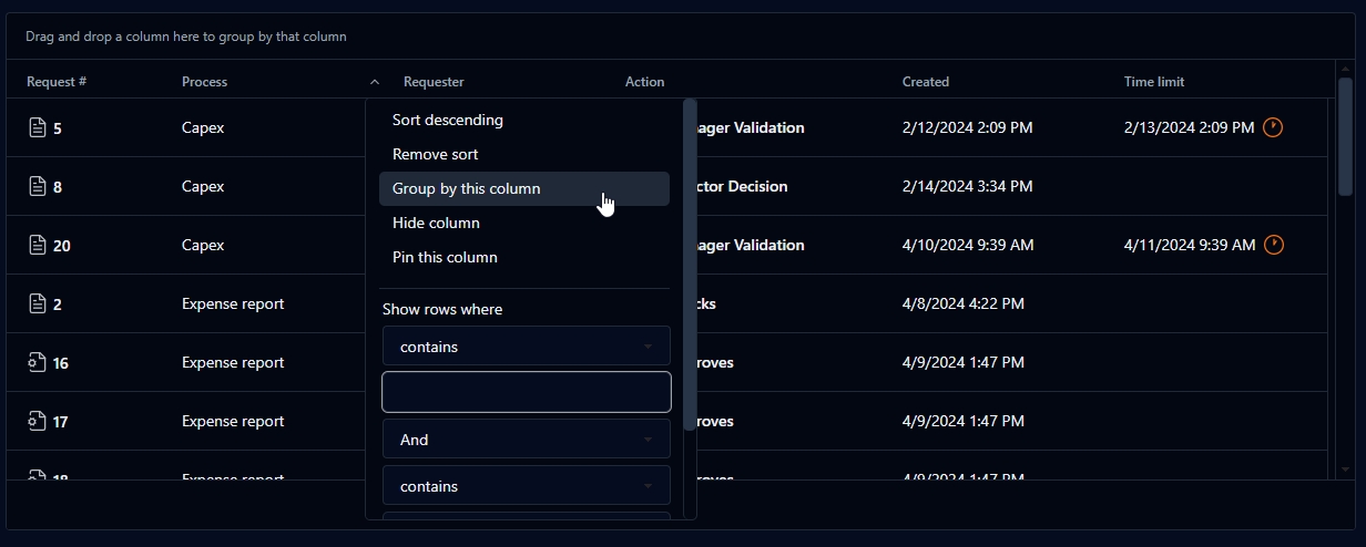 To group the search results by the data in a particular column, drag and drop a column header onto the bar directly above the column headers. You can also hover the mouse over the column header, then click the pencil icon that appears on the right and choose Group by this column from the drop-down panel.