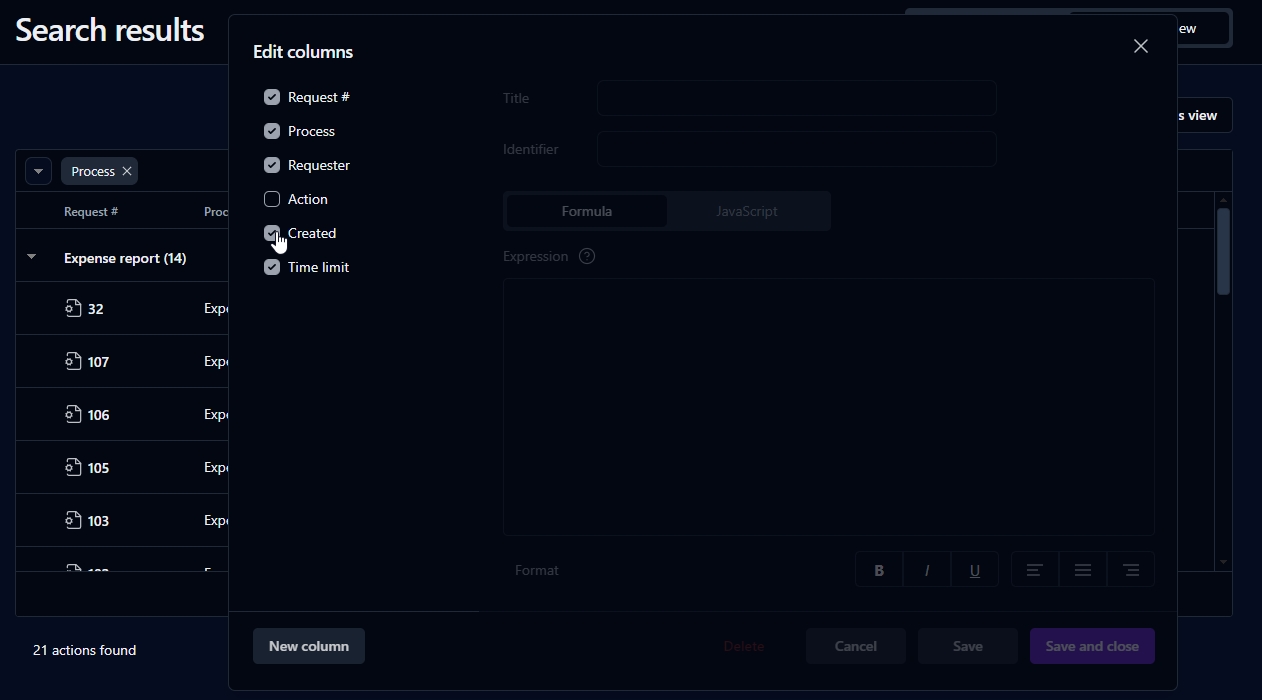 To edit a column, click the Columns button above the search results grid. Here, you can hide a column by unchecking its heading, create a new column, or edit existing column information.