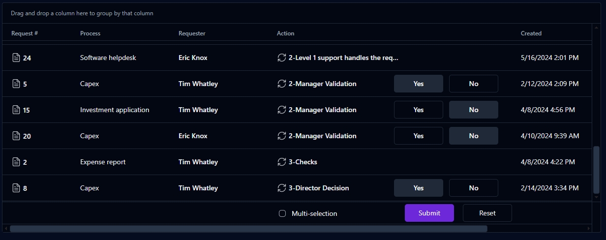 Checking the Multi-selection box lets you select the same approval answer for all actions of the same process by clicking a single approval button. You can also do this without enabling this option by holding down the Alt key and clicking a single button. However, enabling this setting does not automatically submit any actions, so you still have to click the Submit button to complete the actions.