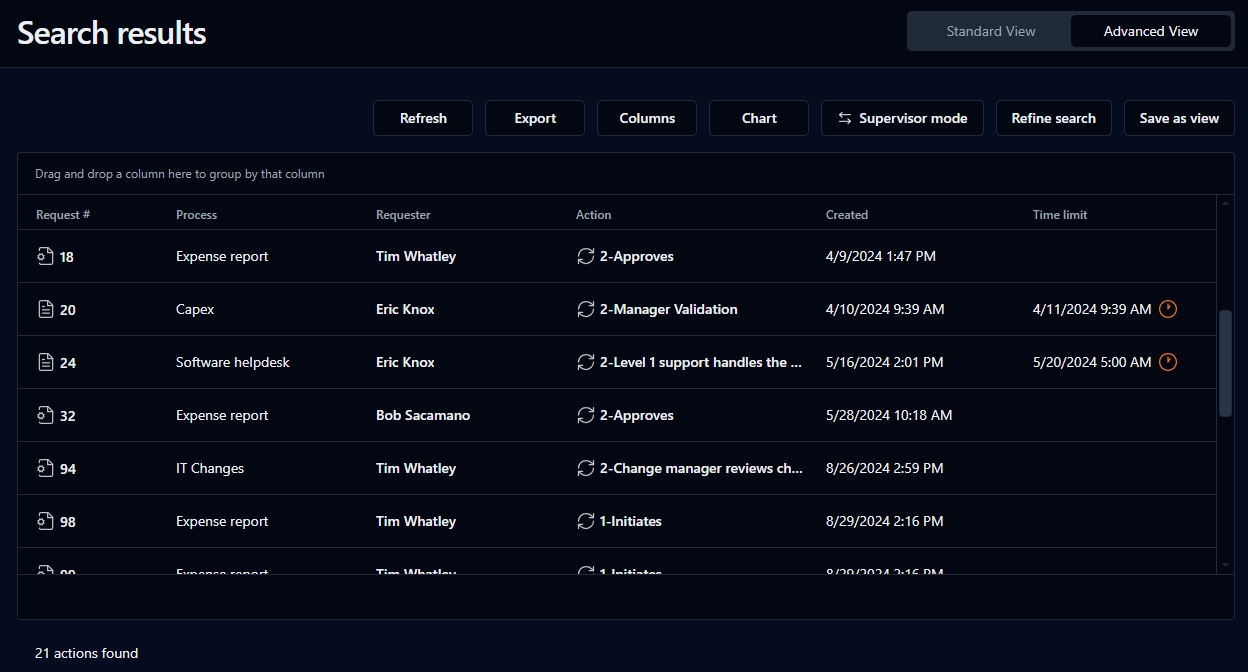 With Advanced view you can view search results in a customizable format. This allows you to view targeted information by filtering and organizing the information to suit your needs. You can also save views, use the Quick approval feature to validate requests, and create and customize charts.
