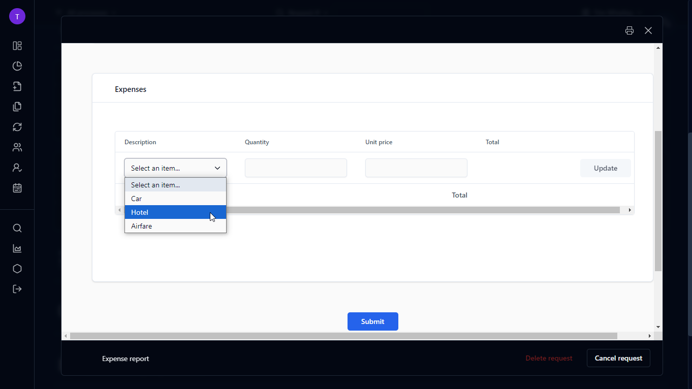 You can fill in and submit information, print the form by clicking the printer icon, navigate to the previous or next request’s Quick view (if applicable) by using the arrows, close the Quick view by clicking the