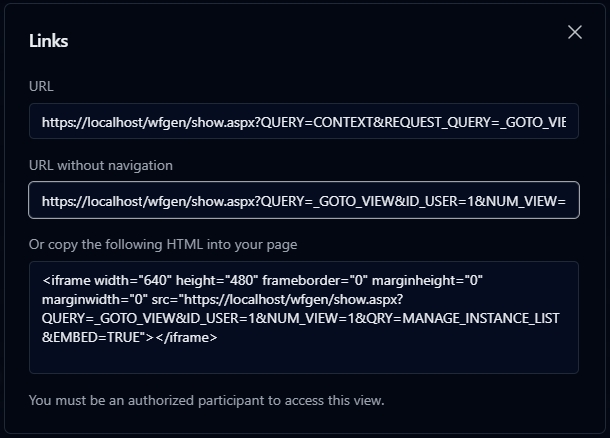 Click Links to display the view's URLs and HTML code, which you can use to embed the view in an external page.